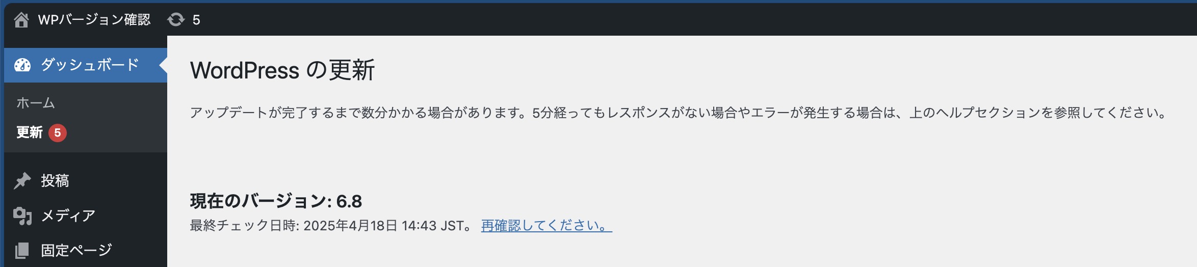 WordPressの管理画面にログインし、「ダッシュボード」→「更新」または「フッターのバージョン表示」を確認してみましょう。