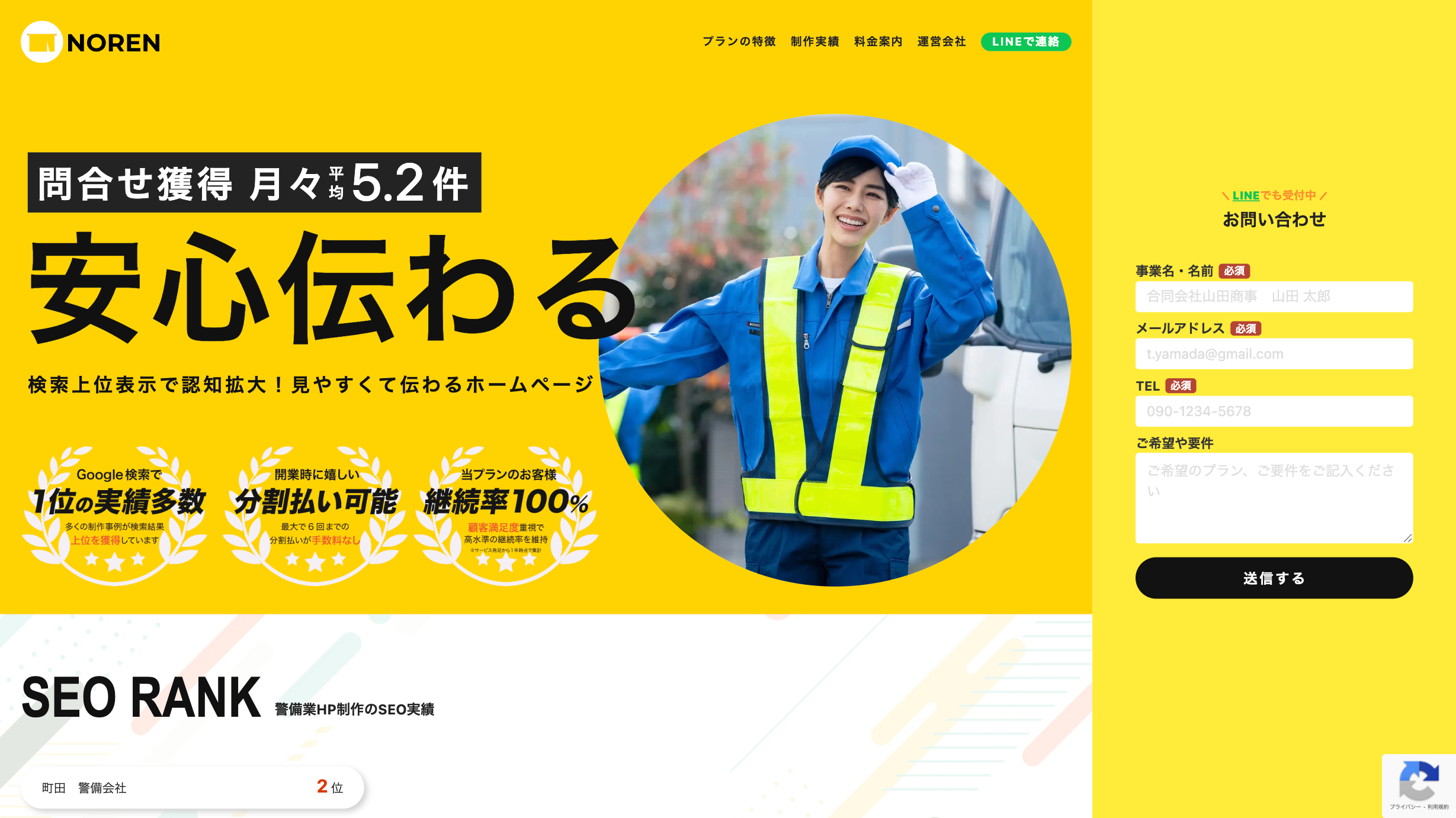 警備会社向けに「集客に強い」ホームページ制作を提供。『集客の一歩目は「知られる」こと』をコンセプトに、しっかりと「見られる」ホームページを低価格・短納期でご提供。SEO対策による認知度の向上で新たな顧客獲得を実現します。