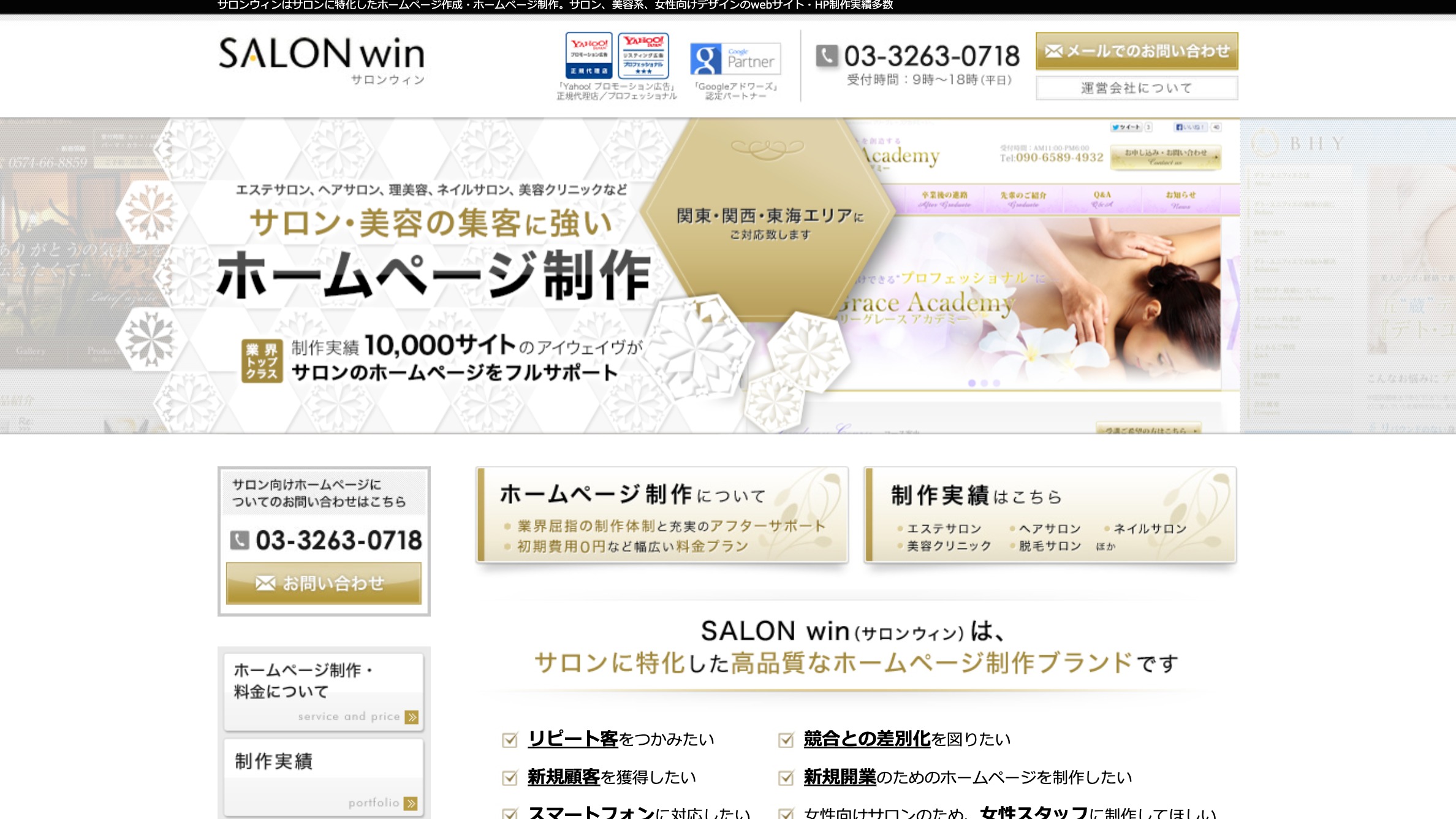 サロンWinは、アイウェイヴが運営する初期費用無料のサロン(ヘアサロン、美容院、エステサロン、スパ、SPA、ネイルサロン)様向けホームページ制作パッケージプランです。ポータルサイトだけでは表現できない貴店の独自性を打ち出すことで、他店と差別化を図ったホームページを制作いたします。