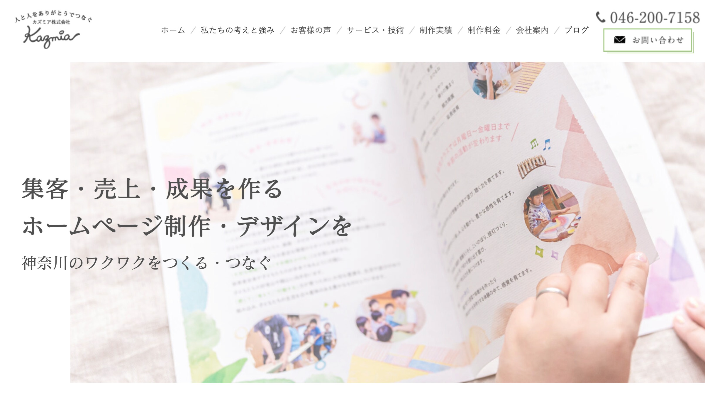 神奈川県(横浜、海老名、川崎、相模原など)を中心としたホームページ制作・広告デザイン会社「カズミア株式会社」です。ブランディング、集客や販売促進、採用活動などの課題解決・目的においてホームページ制作、印刷物デザイン、Webマーケティング、SEO対策など広告作成・デザイン制作周りのご依頼を承ります。