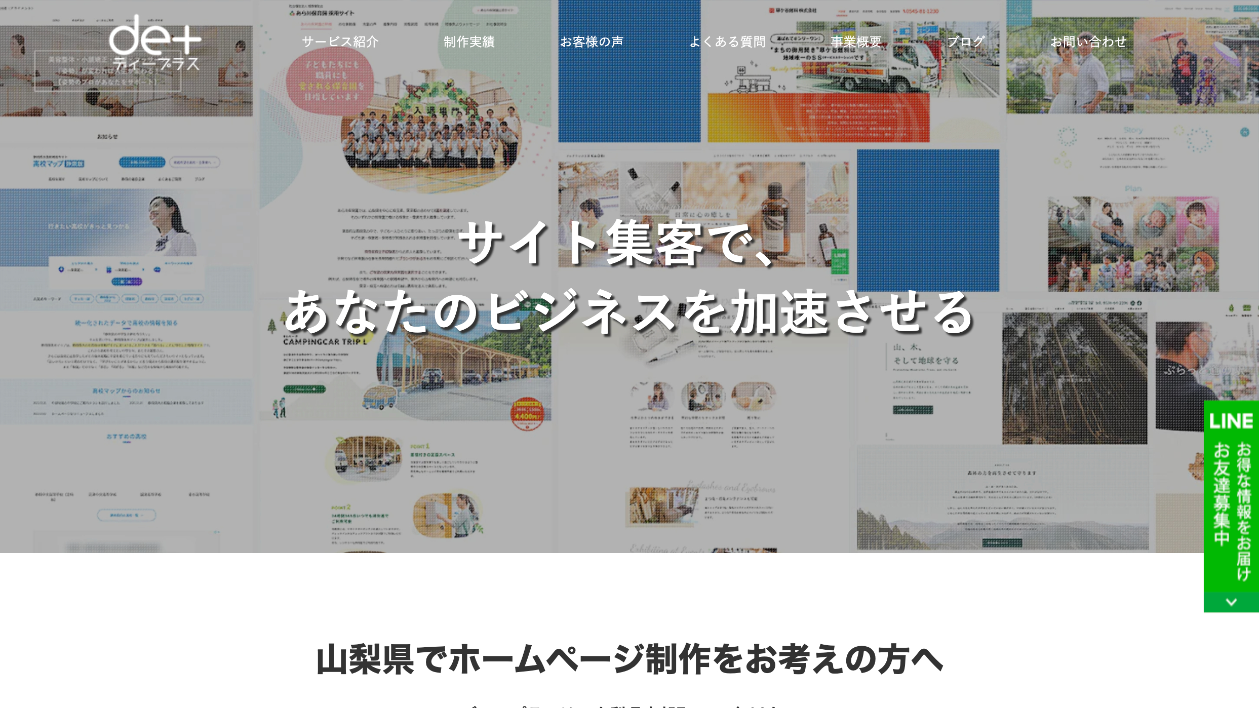 山梨県でホームページ制作(Web制作)をお探しなら、集客/SEOを考えて制作するディープラスにおまかせください。目的に合わせて設計からデザイン、集客方法などを綿密な打合せのもとオーダーメイドでつくり上げていきます。1件でも多く、目標を達成していただくためやお困りごとを解決するために電話や対面形式でご提案しています。個人事業から法人、中小企業のホームページ制作はおまかせください。